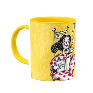 تصویر روی جلد این دفتر یادداشت، یه شخصیت خوشرو و دلنشین رو نشون میده که روی صندلی نشسته، یه پیراهن خالخالی پوشیده و با یه لبخند بزرگ داره با آرامش چای مینوشه و همزمان کتابش رو باز کرده. بخار همیشه عاشقانهای که از فنجونش بالا میره، اون حس لحظههای تماشایی و دنج با یه کتاب و یه جرعه چای رو کامل میکنه. پسزمینه زرد رنگ براق و شاد، انرژی مثبتی به طراحی داده و این حس بازیگوشی و دعوت کردن به آرامش رو به خوبی منتقل میکنه.